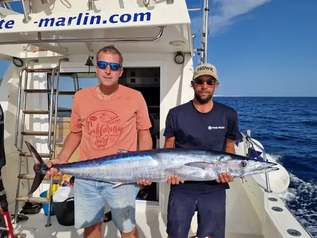 Seguimos teniendo suerte con el wahoo, temprano en la mañana tuvimos 2 picaduras al mismo tiempo, logrando batallar y atrapar un Wahoo de 22/24 kg, perdimos el otro, 10 minutos después tuvimos otra picada de wahoo pero lo perdimos en la batalla, así es pescar, pero contentos con la acción, Felicitaciones a nuestro amigo, compañero, tripulante y pescador Dominik en su cumpleaños número 16, Dios los bendiga, gracias a nuestro amigo Chris por confiarnos sus días de pesca un año más en el White Marlin, siempre adelante pescadores.